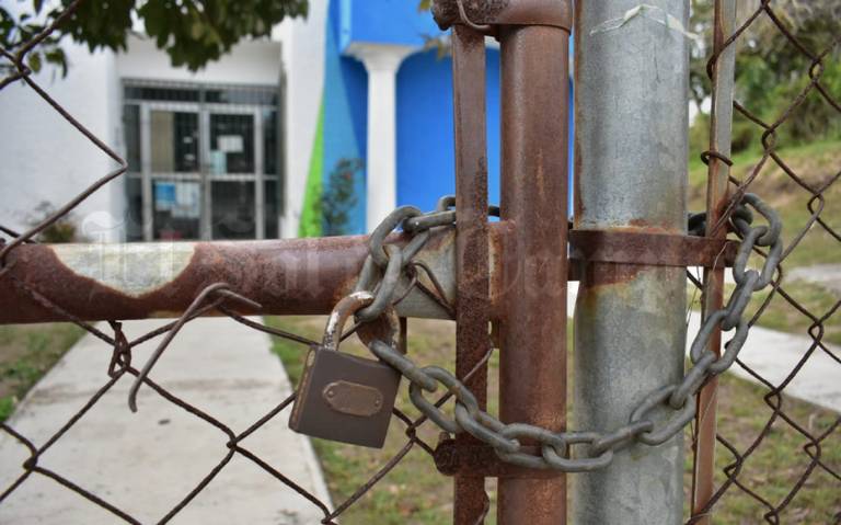 En este ejido, donde no se han registrado casos de coronavirus, el Centro de Salud se encuentra cerrado con cadenas, mientras que el salón de actos luce vacío.